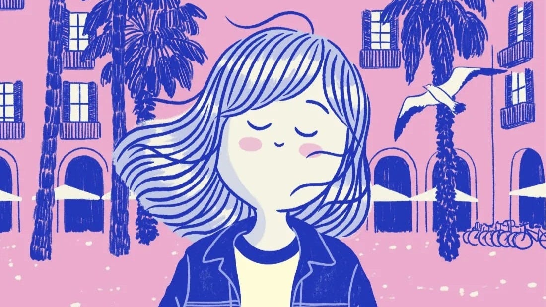 Agustina Guerrero es conocida por su personaje La Volátil, pero yo la descubrí ahora y me llevé una grata sorpresa con su arte. Hoy cuenta un día en la vida de la protagonista en el que decide apretar el botón de pausa y dejarse llevar por lo que salga. Aprovecha la hora del almuerzo en la oficina para salir a caminar y apreciar el paisaje que la rodea todos los días, pero que rara vez está en sus pensamientos.